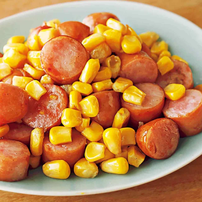御殿場産のソーセージと相性の良いバターで炒めたトウモロコシを熱々の鉄板にのせて
